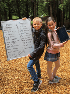 Les élèves marchent et observent l’environnement autour d’eux. Sur leur tablette à pince, ils écrivent tous les noms des éléments qui les entourent. Ils ajoutent le bon déterminant pour chaque nom. Ils classent ensuite ces noms dans un tableau en deux colonnes : noms féminins vs noms masculins.  De retour au point de rassemblement, les élèves se placent deux par deux. À tour de rôle, un élève nomme un mot qu’il a observé et son coéquipier tente de l’écrire au pluriel. Ils composent ensuite 5 phrases originales en utilisant le plus de noms observés lors de leur marche. Pour finir, ils partagent leur création au groupe.