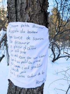 Chaque élève écrit un poème ou une partie d’un récit qu’il accroche sur un arbre ou une clôture dans un parc ou un boisé. Les élèves se promènent d’arbre en arbre pour lire les œuvres de leurs pairs.