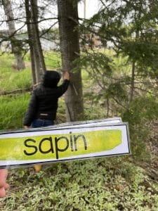 Au préalable, familiariser les élèves avec de nouveaux mots de vocabulaire. Leur remettre une feuille qui liste des mots de vocabulaire à repérer dans l’environnement. Cette feuille de comptabilisation est constituée de deux colonnes : à gauche les mots étiquettes et à droite l’espace pour compter les éléments. En petites équipes, les élèves se promènent dans une partie différente d’un territoire prédéfini. De retour en grand groupe, les élèves présentent leurs trouvailles à l’oral en décrivant ce qu’ils ont observé sur leur chemin.