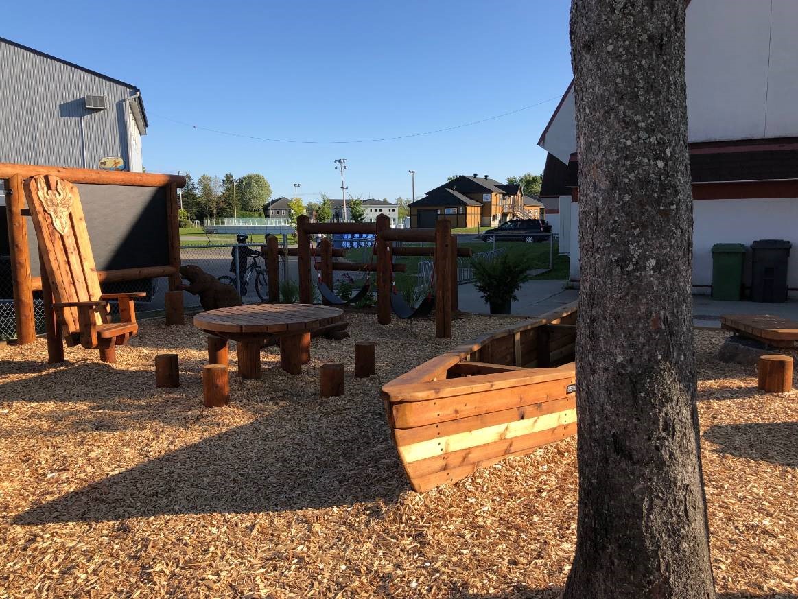 Si vous optez pour une construction classique tel qu’un gazebo sur une base de béton avec des tables à pique-nique ou des bancs, la question ne se pose pas. Par contre si votre classe extérieure sert aussi de lieu de socialisation et que l’on y retrouve des buches, des pierres, des bancs, il est important d’aménager le sol avec un revêtement comme de la fibre de cèdre (comme les modules de jeux) ou encore du tapis synthétique. Ne pensez pas à économiser en laissant du gazon dans votre classe nature, vous allez le regretter. Pensez à son entretien et dites-vous que le personnel d’entretien ne partage peut-être pas votre amour pour la classe extérieure: leur objectif est plutôt d’aller le plus vite possible.