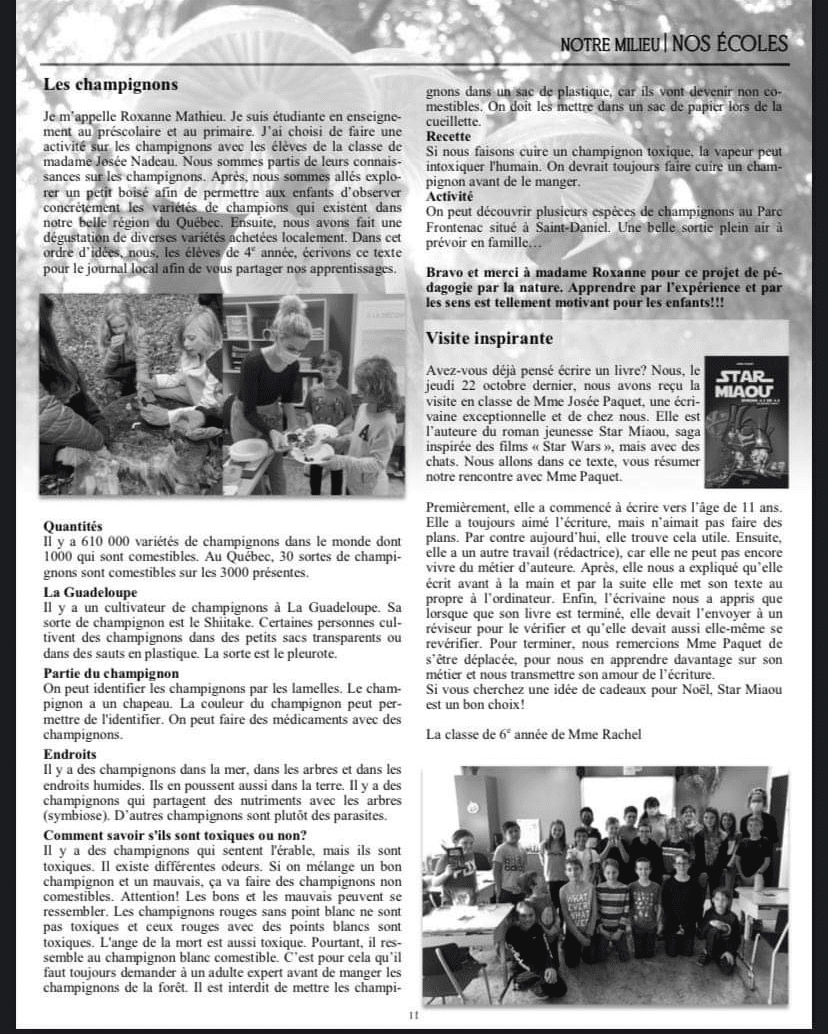 Cette activité intégrant les sciences et le français comprend une balade en forêt (observation) suivie d’une dégustation de champignons!