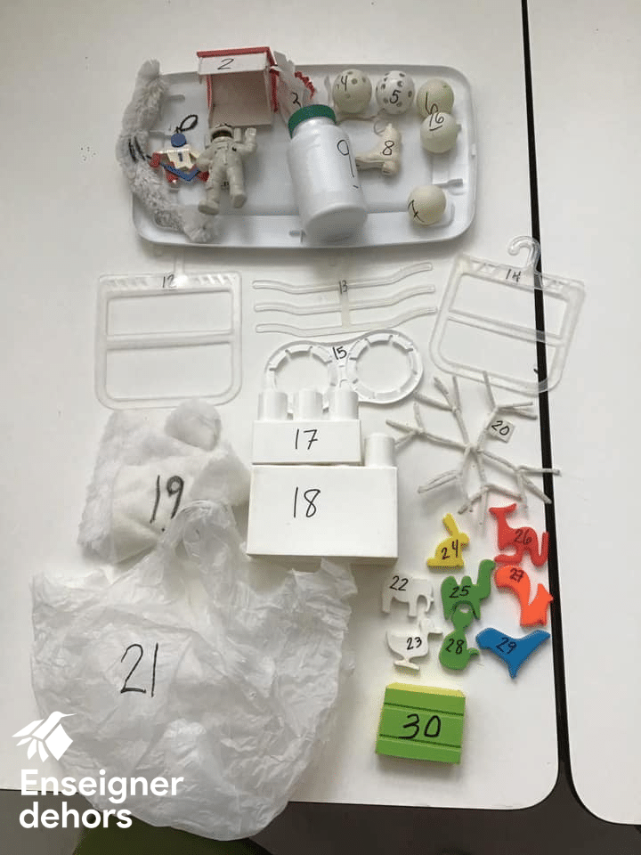 - Demander aux élèves comment ils pourraient procéder pour dénombrer les objets récoltés et comment être certain que tous les objets ont été trouvés. Écouter les stratégies et les modéliser.
