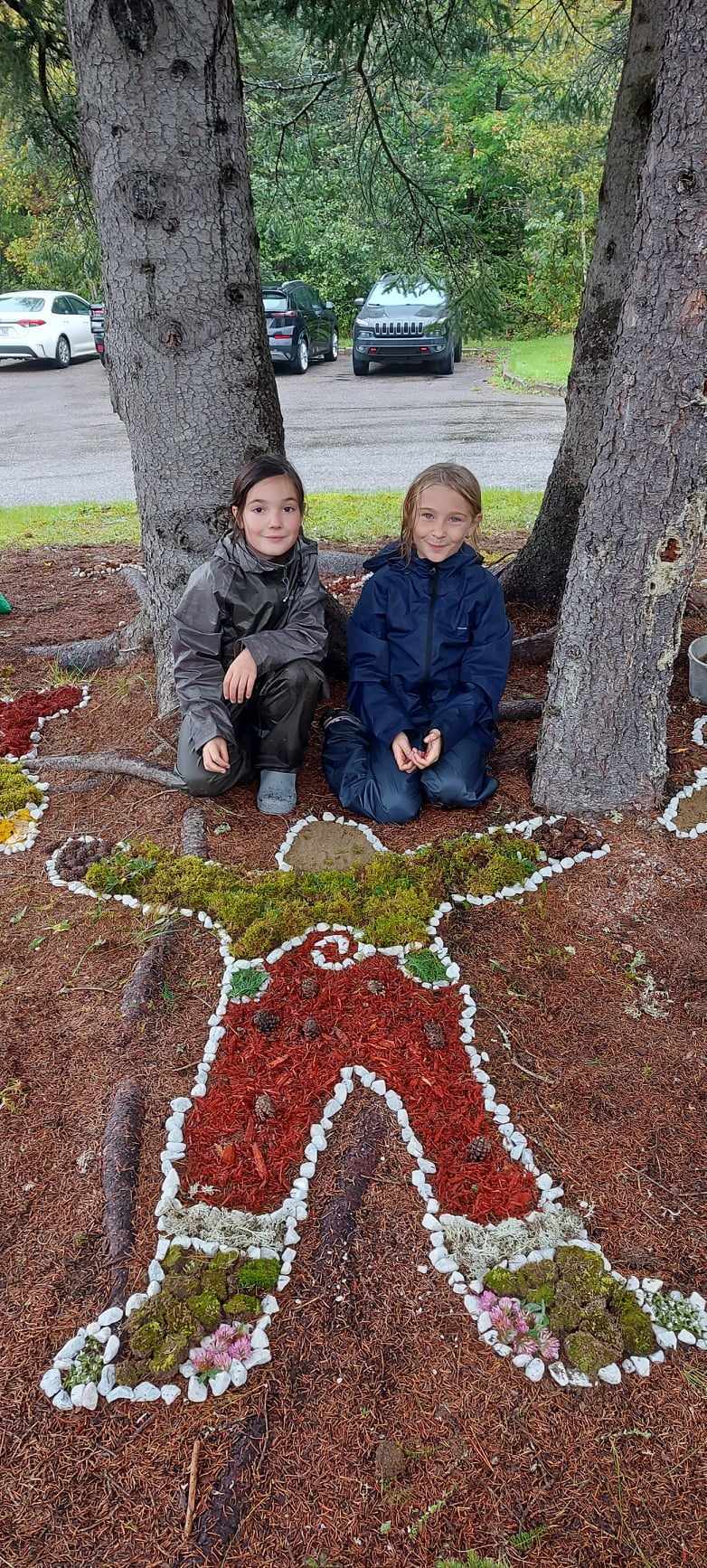 - Séparer le corps en différentes sections par des roches de façon symétrique. Remplir chaque section avec un élément de la nature différent (roche, cocotte, feuilles, sables, fleurs, etc.). Rappeler aux élèves l’importance de prendre des objets de la nature au sol, avec modération et à des endroits diversifiés pour permettre à la nature de bien se régénérer.