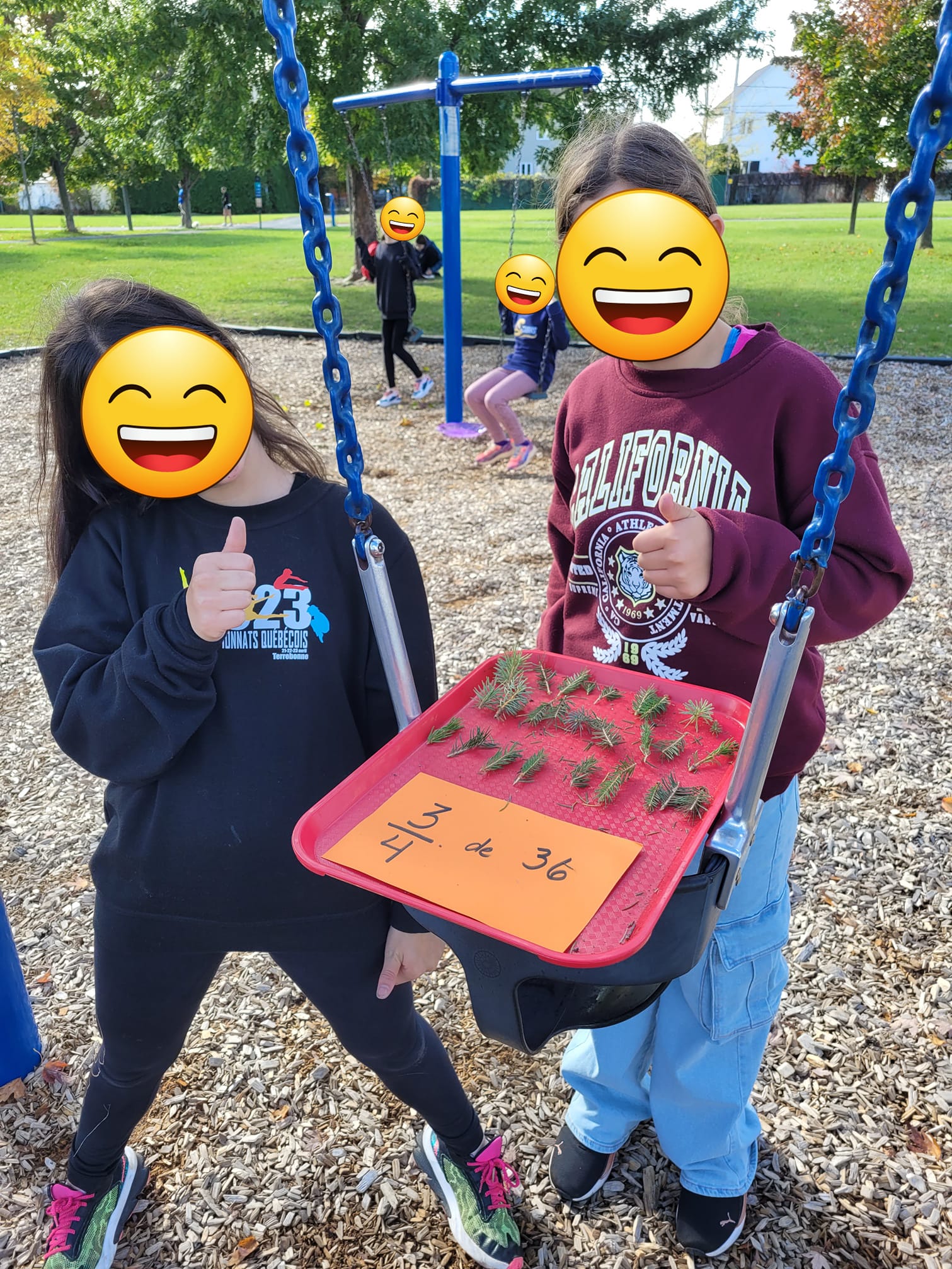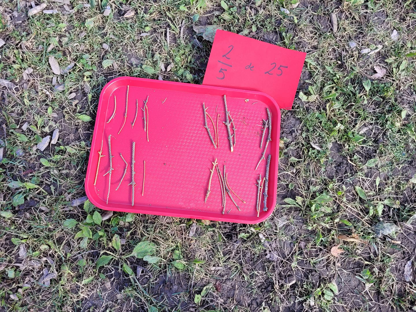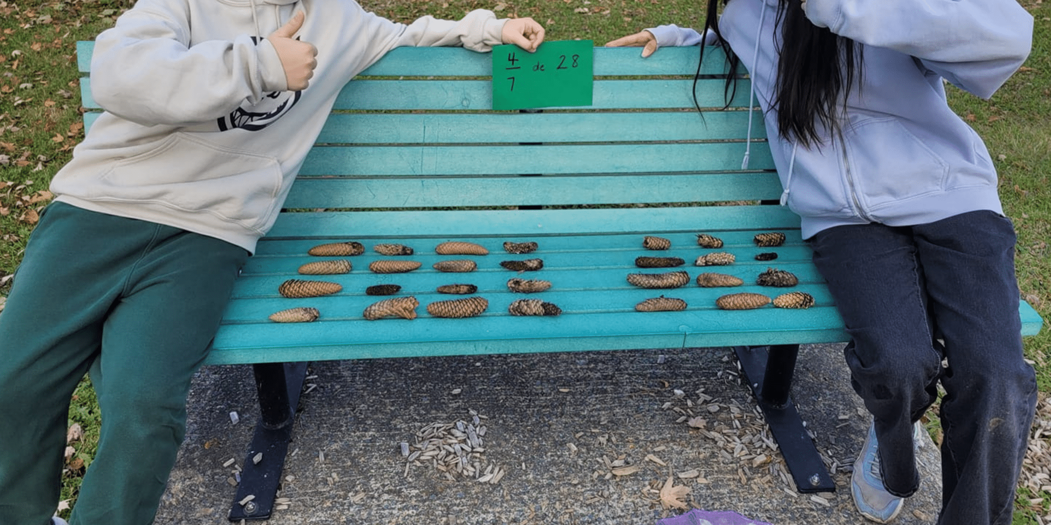 • Les élèves doivent trouver différents éléments naturels pour représenter chaque fraction. Par exemple, ils peuvent utiliser des roches, des cocottes, des branches, des fleurs, etc.
