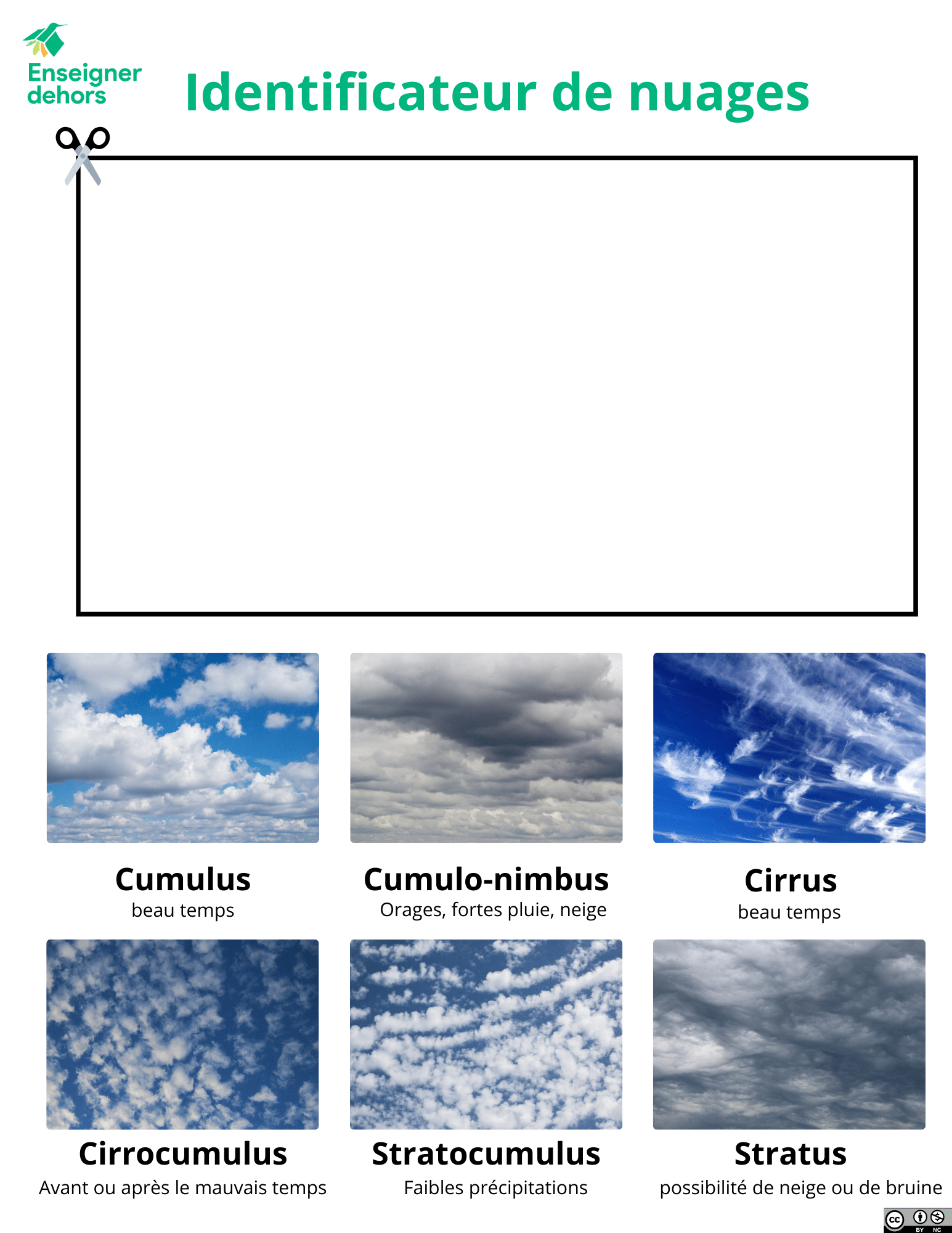 - Construire un identificateur de nuages (voir matériel). Couper le rectangle au centre de la feuille puis coller l’affiche sur un carton pour plus de rigidité. Les élèves peuvent regarder le ciel par le rectangle et tenter d’identifier les nuages.