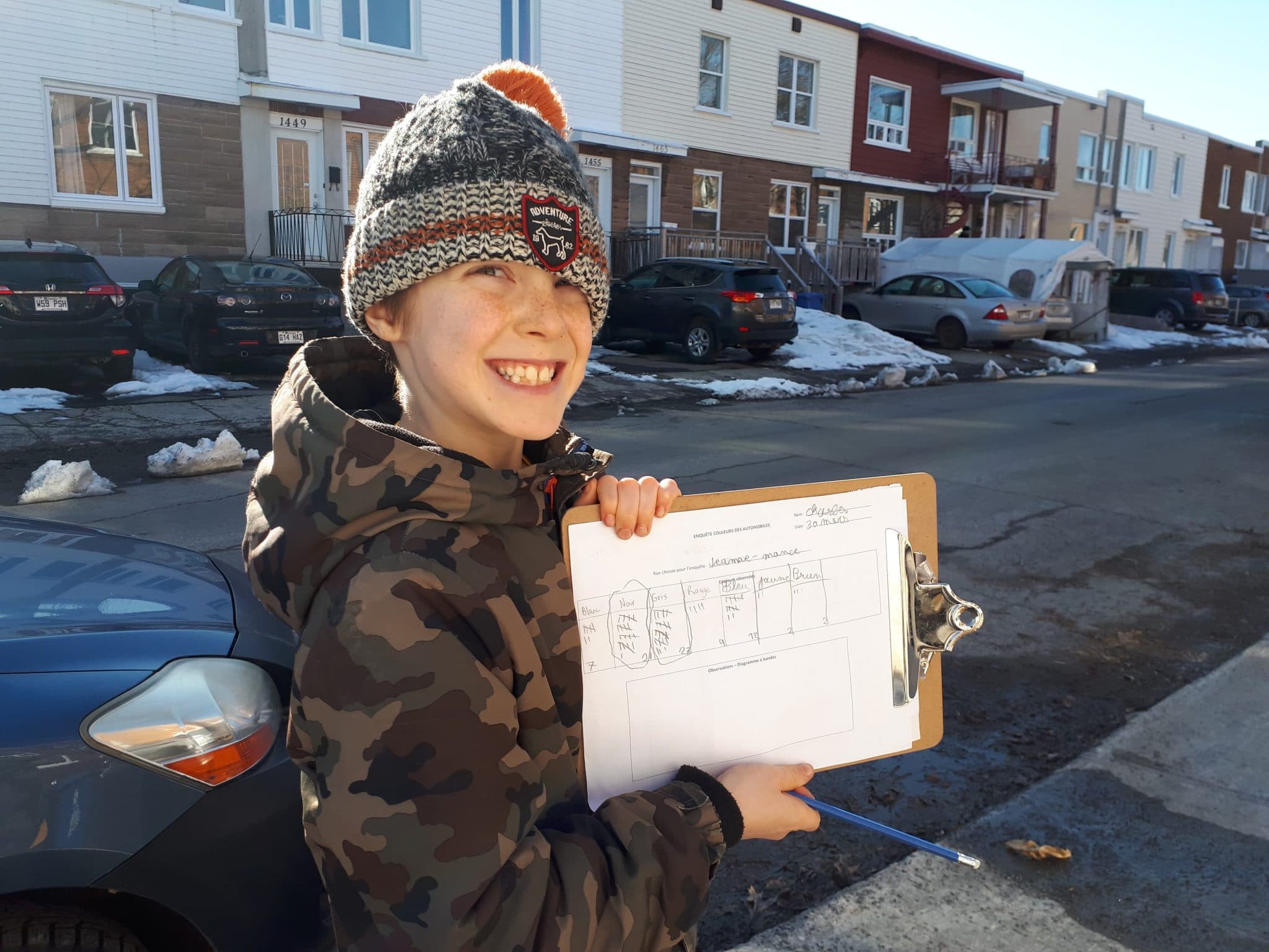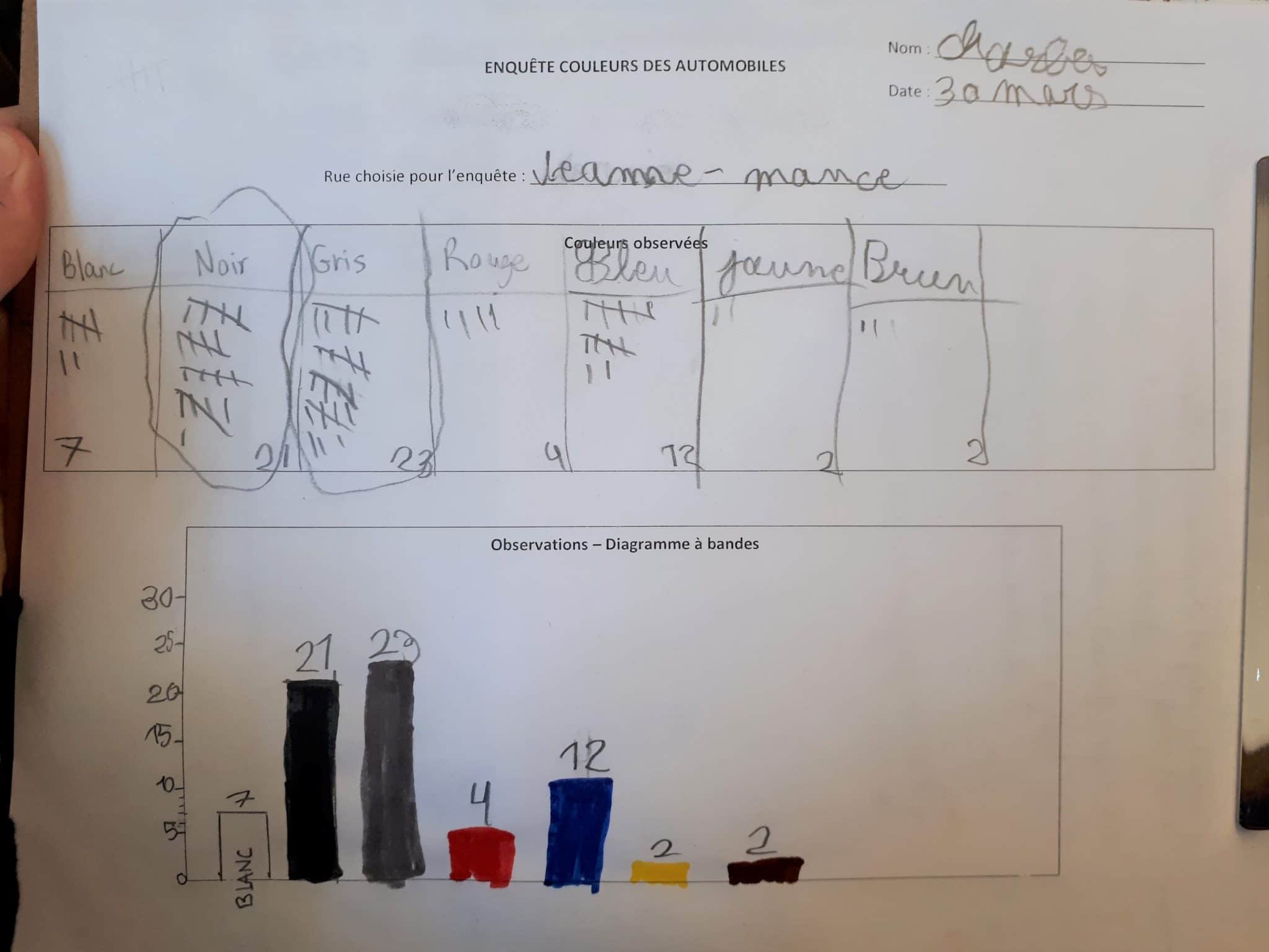 - Sortir dehors et marcher dans la rue choisie (~ 30 m). Les élèves prennent les notes (nombre d’autos et les couleurs de chacune).
