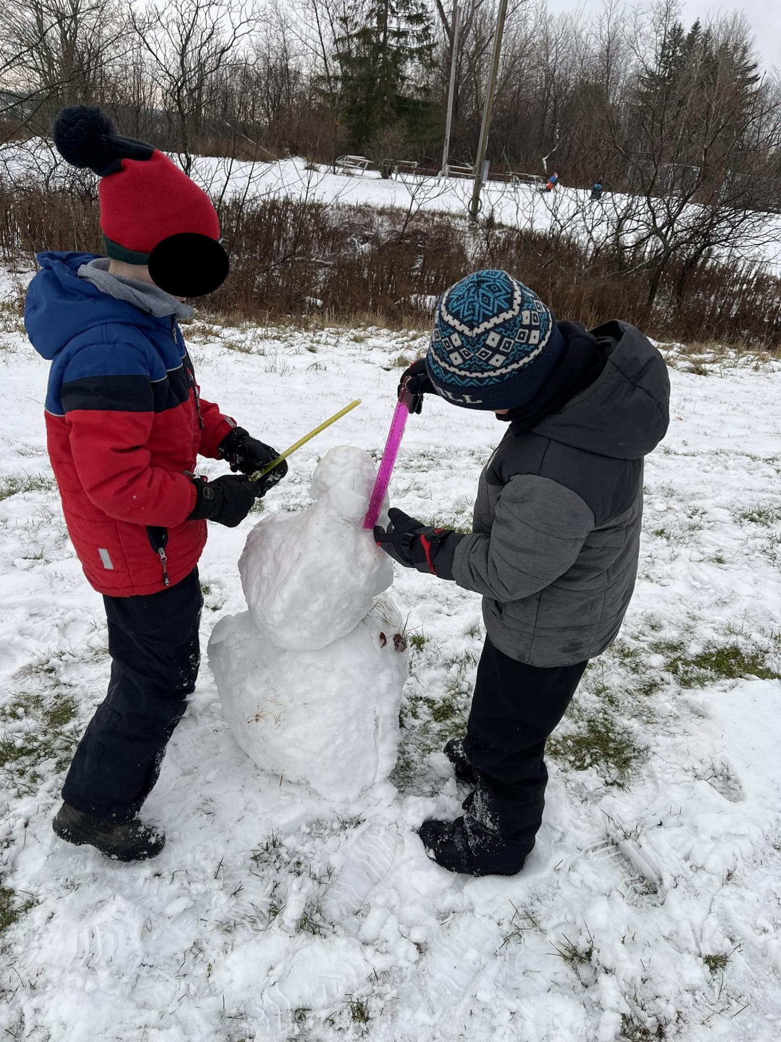 - En équipe de deux, les élèves ont pour mission de fabriquer un bonhomme de neige (ou tout autre personnage de leur choix).