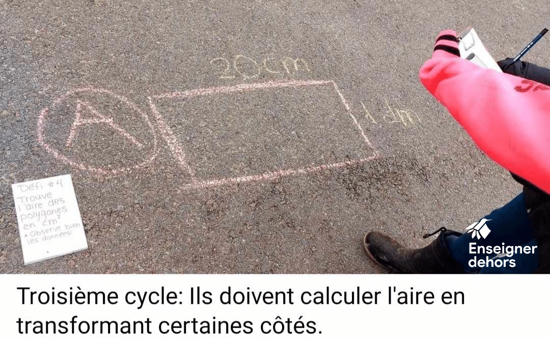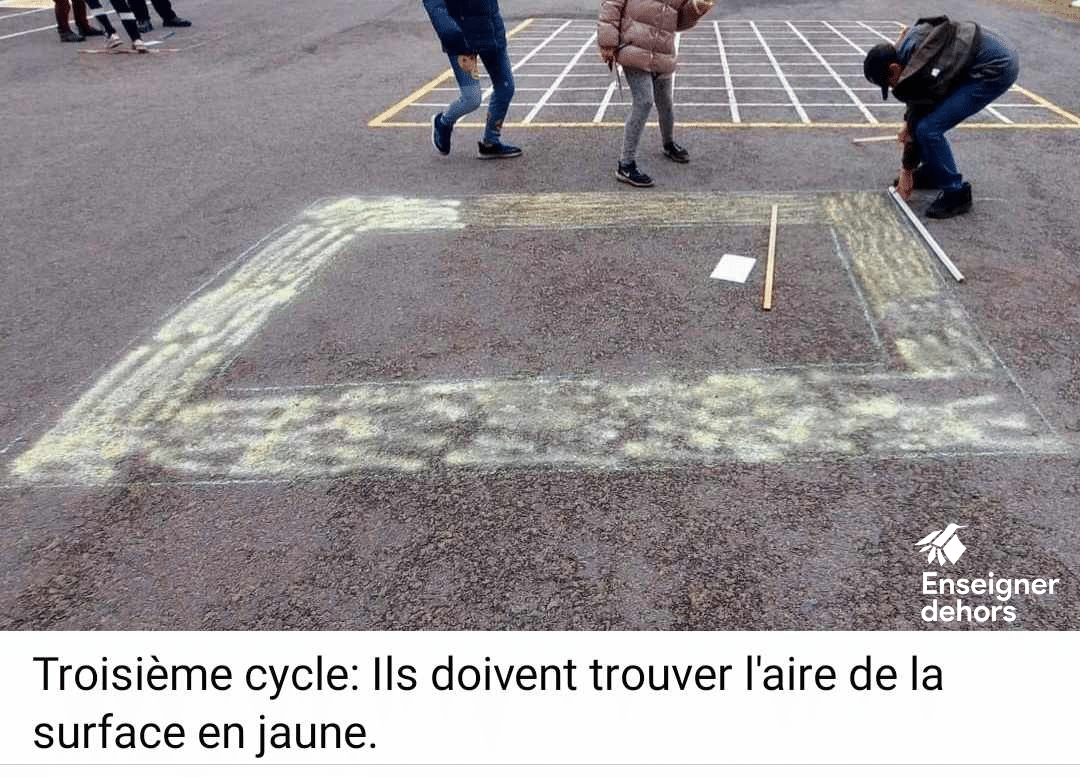 Une activité pour réviser les concepts d’aire à l’extérieur avec les élèves du 3e cycle. Ils doivent réaliser 5 défis différents sur la cour d’école.