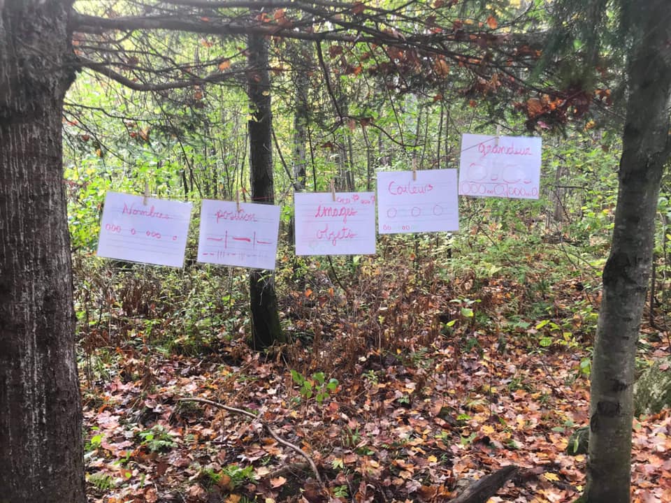 Utiliser le matériel rassemblé lors de lors de l’activité (feuilles, aiguilles de pin, branches, roches, fleurs, etc) pour créer un alphabet secret avec tous les élèves de la classe. Exemple :
