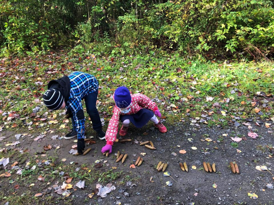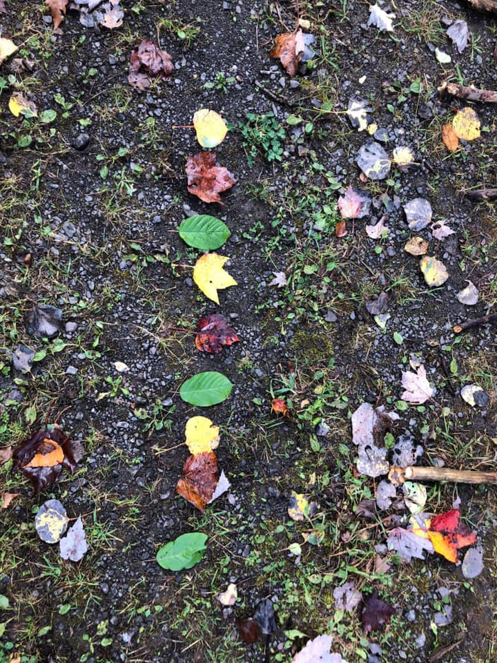 • Mettre les élèves en équipe de deux et leur attribuer un type de régularité non numérique. Expliquer qu’ils auront 15 minutes pour utiliser le matériel dans la nature et représenter leur régularité (voir photos pour exemples). Ils peuvent réaliser plusieurs ‘suites’ s’ils ont le temps.