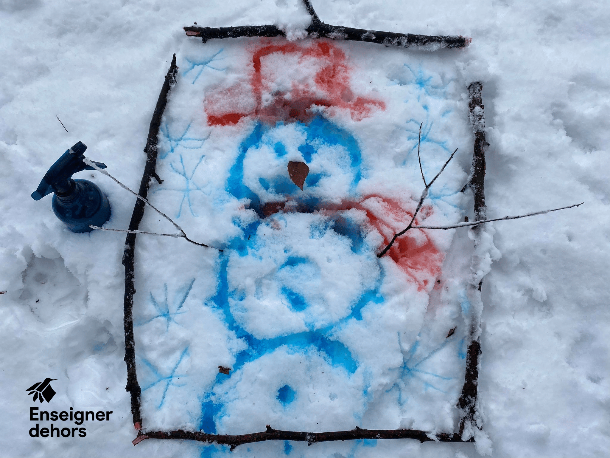 Prendre une photo de chaque œuvre. Lorsqu’ils ont terminé, les élèves peuvent réaliser d’autres œuvres artistiques de leur choix sur la neige ou réaliser un fort ou bonhomme de neige coloré.