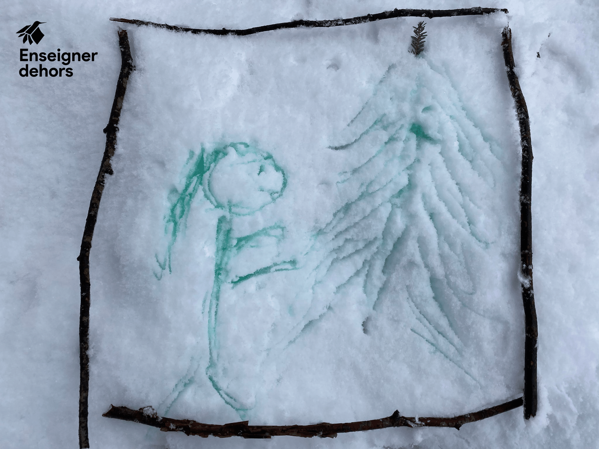 Chaque enfant explore sa créativité en formant un cadre géométrique de son choix, utilisant des branches ou la neige pour en définir les contours.